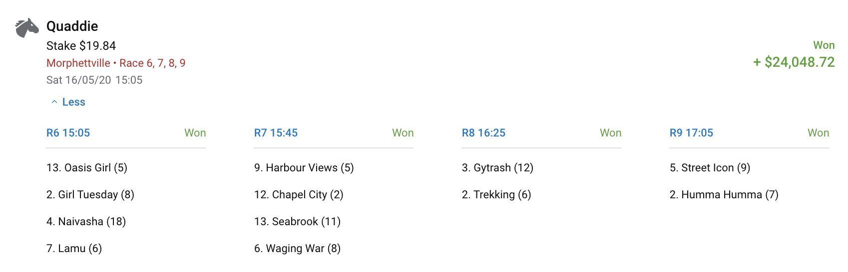 The result was a staggering $24,048 collect from their % return from the Adelaide Racing Tips Quaddie for his $19.84 outlay.