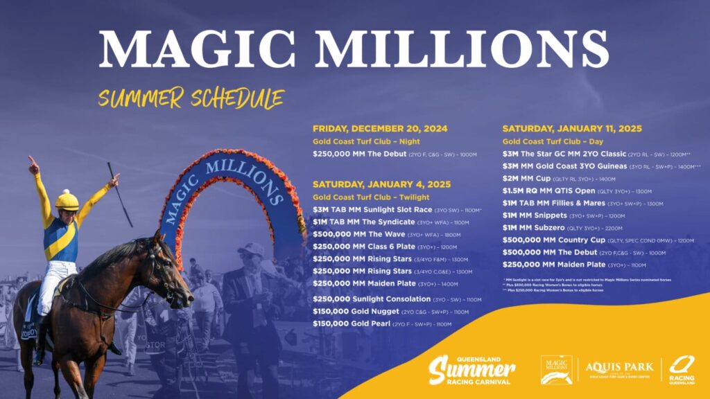The Magic Millions Gold Coast Racing Carnival over 2 weeks kicks of Saturday 10th and 17th January. The meeting feature the Magic Millions Classic for the 2 year olds and the Magic Millions Guineas for the 3 year olds. With the Gold Coast meeting startin this Saturday the major race to kick us off is the Gold Coast Magic Millions Sunlight Plate over 1100 metres. It is Race 8 on the Saturday Gold Coast Racing Tips schedule and the feature race.